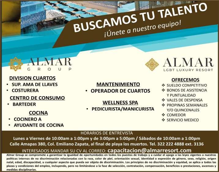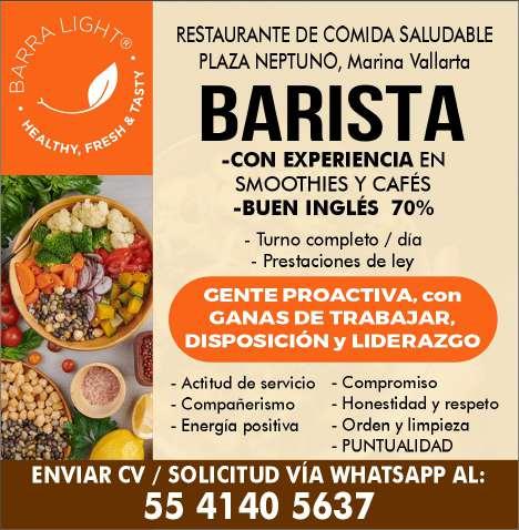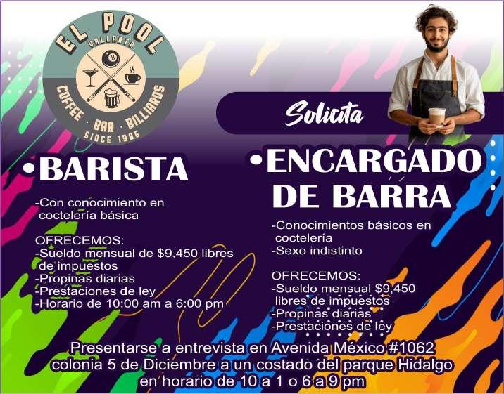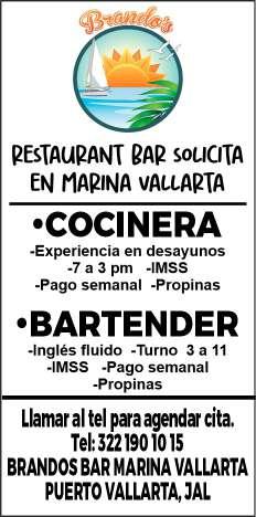 Restaurante Bar en la Marina solicita cocinera, experiencia en desayunos y bartender con inglés fluido. Para agendar cita llamar al tel. 322 19 010-15.+