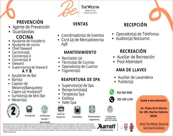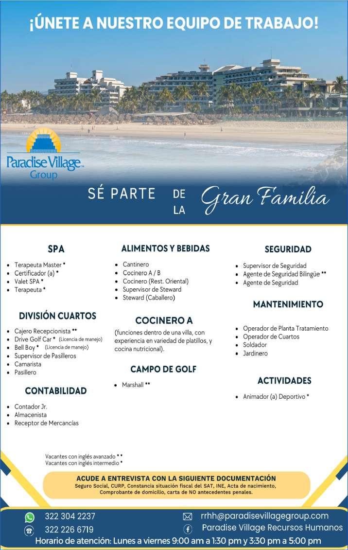 Área de Nuevo Vallarta, solicitamos ayudante de mantenimiento, aux. de almacén, steward, mesero. Presentar solicitud elaborada. Inf. 322 29 704-03.+