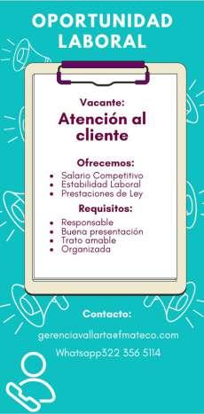 experiencia en atención al cliente, trabajo presencial. Tel. 322 47 034-67.+