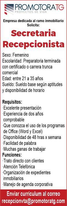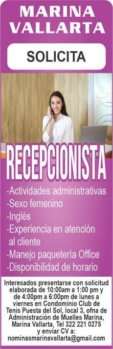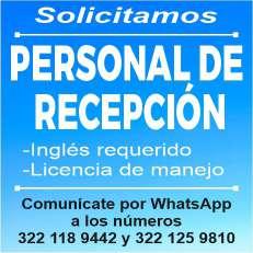 Estamos buscando recepcionista con inglés, sexo indistinto. Informes al. 322 19 109-68.+