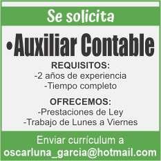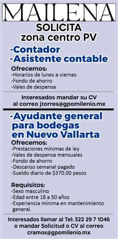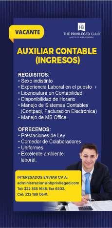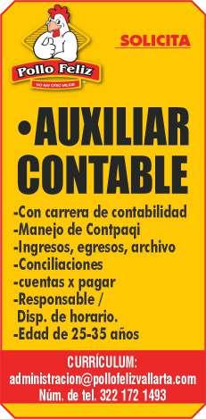 Solicita contador (a), licenciatura concluida y vivir en Puerto Vallarta. Llamar al tel. 331 06