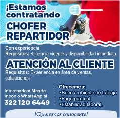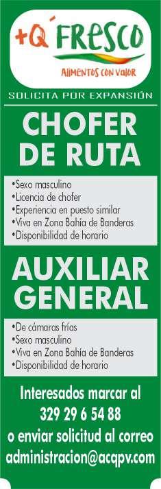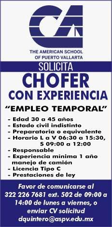 Institución educativa solicita chofer con experiencia, edad de 30 a 45 años, licencia tipo C, experiencia manejando camión, preparatoria mínima o equivalente. Interesados llamar en un horario de 9am a 2pm al tel. 322 22 676-81, ext. 502 .+