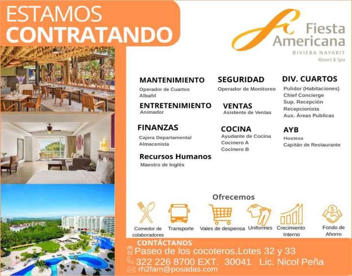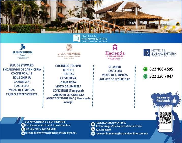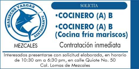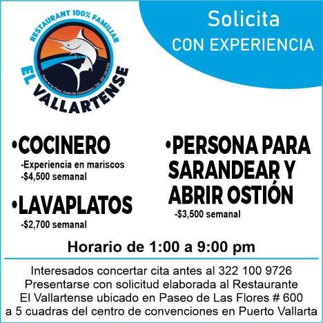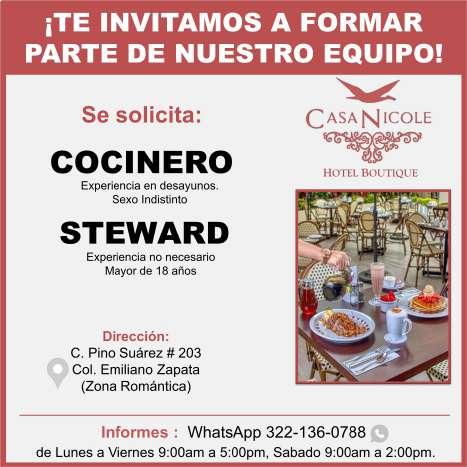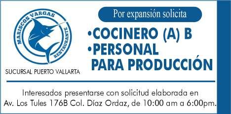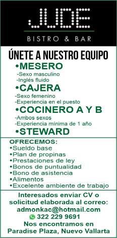 Buscamos cocineros B con experiencia, hostess con buena presentación, mesero con disponibilidad de horario. Inf. 322 22 309-28, 322 22 309-29.+