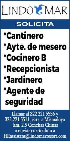 Solicitamos cocinero, steward, barista, jardinero, operador de retroexcavadora, chofer de pipas y chofer de compras. Para todos los puestos ofrecemos apoyo de transporte y alimento. Interesados presentarse en RH del Campo de Golf Flamingos de Bucería. 331 00 834-13.+