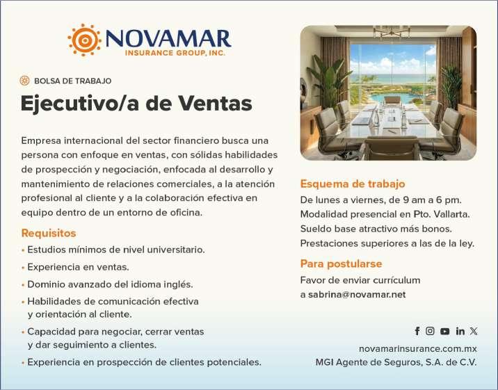 Se solicita ejecutivo de ventas con experiencia en ventas. Enviar CV a sabrina@novamar.net