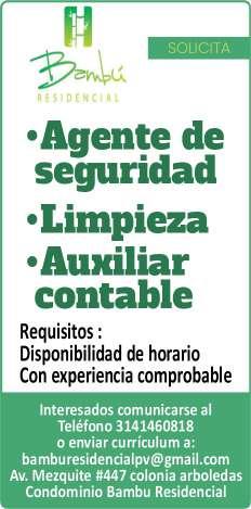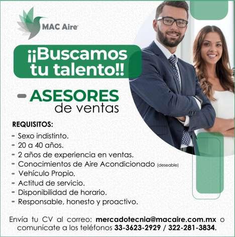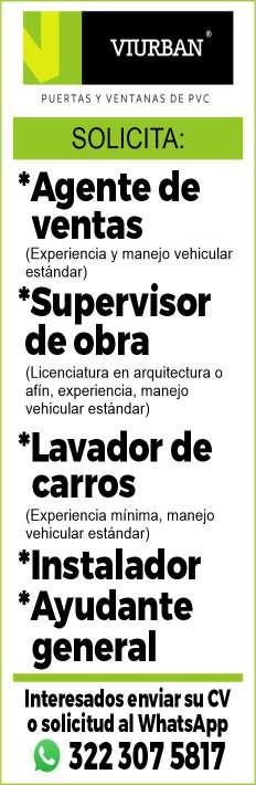 Solicitamos asesor de ventas, agente de seguridad y auxiliar de limpieza. Pide cita al tel. 322 21 666-26.+
