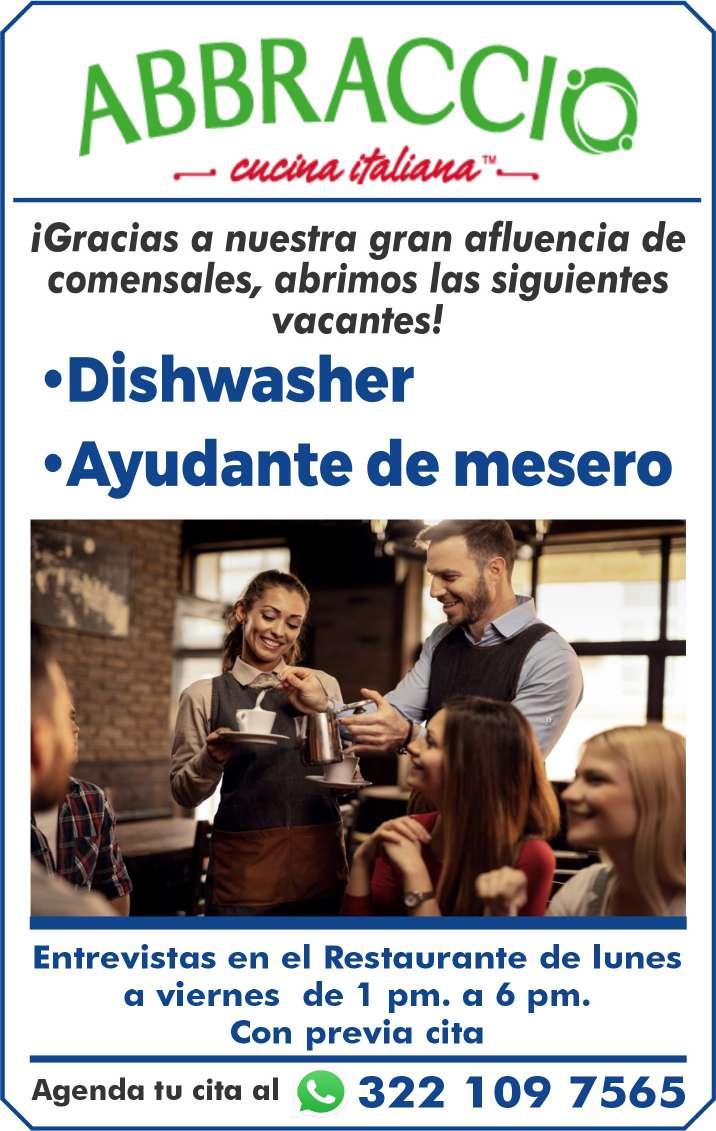 Solicitamos urgente ayudante de mesero y cocinero. Contratación inmediata. Informes. 322 21 057-28.+