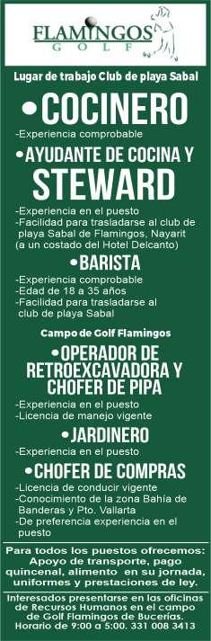 Solicitamos cocinero, steward, barista, jardinero, operador de retroexcavadora, chofer de pipas y chofer de compras. Para todos los puestos ofrecemos apoyo de transporte y alimento. Interesados presentarse en RH del Campo de Golf Flamingos