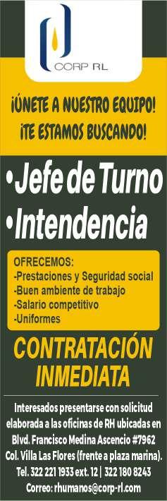 intendencia, contratación inmediata. Tel. 322 22 119-33.+