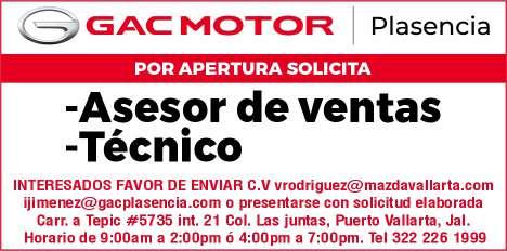 Grupo Plasencia: Solicitamos asesor de ventas en seminuevos, asesor de ventas autofinanciamiento, técnico, lavador pulidor, hojalatero y office boy. Informes al tel. 322 22 619-99.+