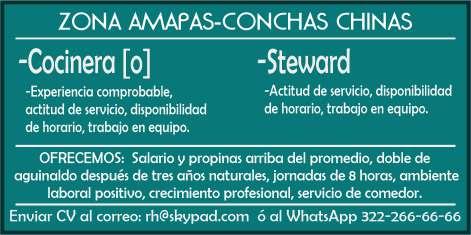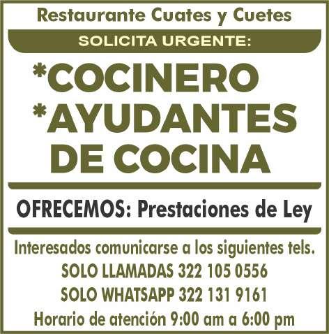 Se solicitan urgentes: Ayte. de cocina, cocinero, persona para inventarios y almacén. Solo llamadas de 9:00 am a 6:00 pm, no mensajes al. 322 13 19161.+