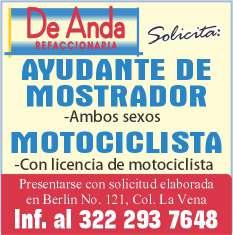 nanciamiento, técnico, lavador pulidor, hojalatero y office boy. Informes al tel. 322 22 619-99.+
