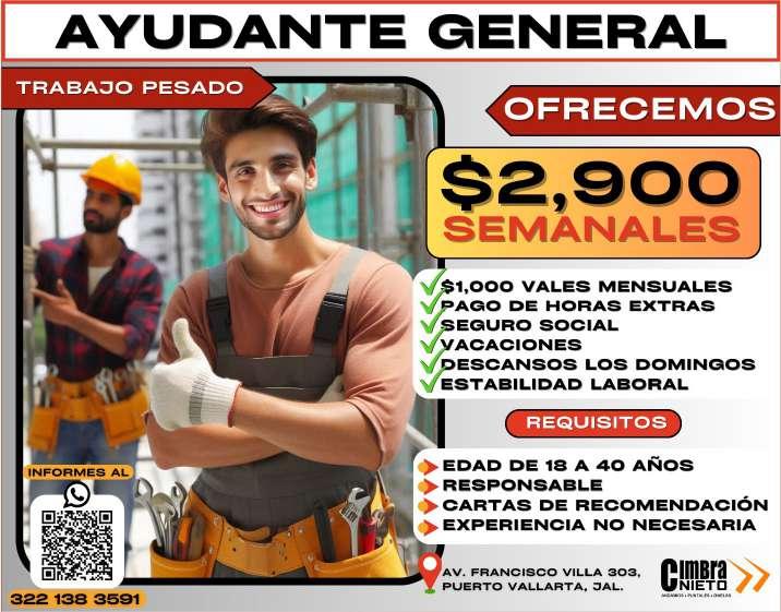 Se solicita ayudante general para trabajo pesado, ofrecemos $2,900 semanales. Informes al. 322 13 835-91.+