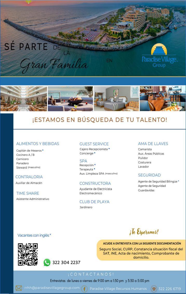 tes. Ofrecemos sueldo base semanal, bono mensual más comisiones. Enviar cv: ventas@ polarisvallarta.com Tels. 322 11 256-20, 322 11 437-50.+