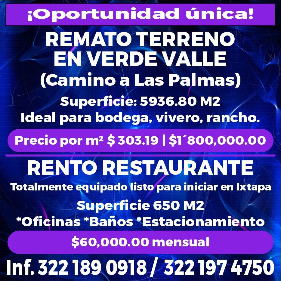 Col. Verde Valle 5,936.80 M2, ideal para bodega, vivero o rancho. $1´800,000. Inf. 322 18 90918, 322 19 747-50.+