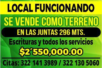 Col. Las Juntas, 10x29.60/296 mts., local en venta como terreno, con escrituras, todos los servicios. $2’550,000. Inf. y citas. 322 13 050-60.+