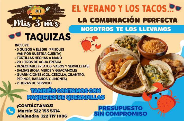 ¿Tienes una fiesta o evento? Nosotros te llevamos los tacos. Varios guisos a elegir, presupuesto sin compromiso. Inf. 322 11 710-86, 322 15 553-14.+