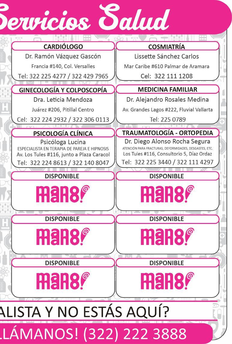 Manicure y pedicure spa, depilaciones, masajes, tratamientos faciales y corporales, informes y citas al. 322 15 031-24.+
