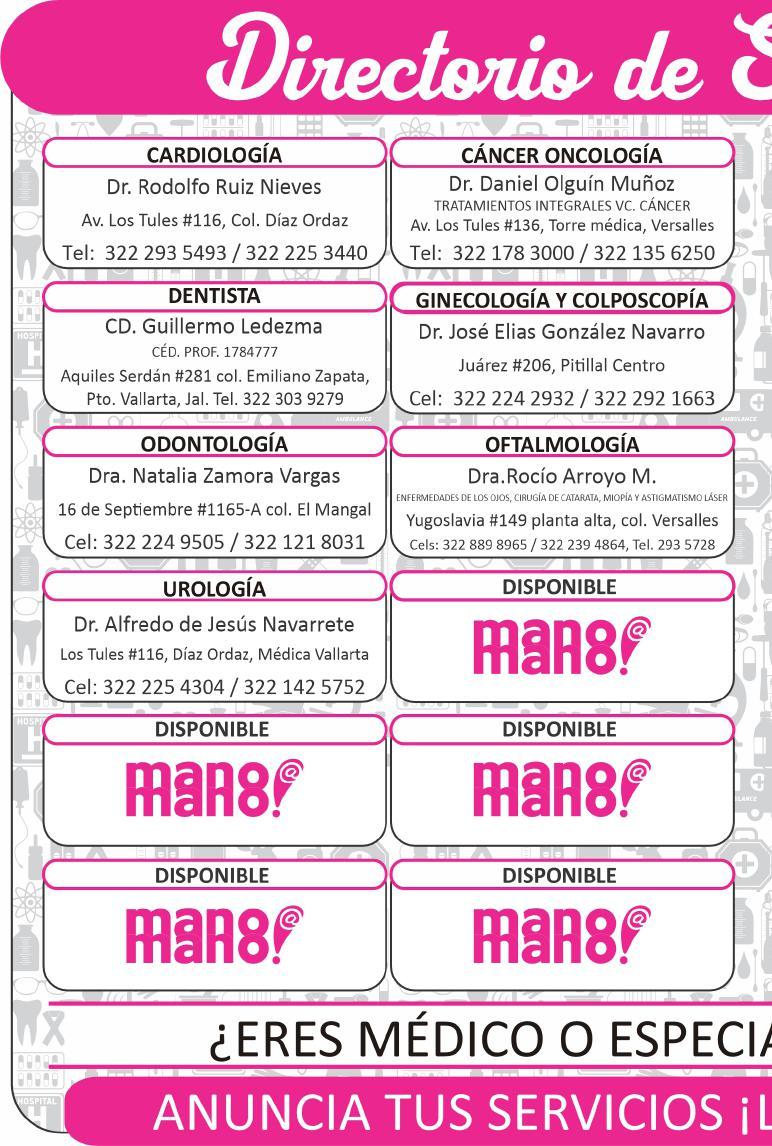 quete incluye consulta, examen ginecológico, mamario, papanicolau y colposcopía, $750, Juárez #206, Pitillal Centro. 322 22 429-32, 322 30 601-13.+