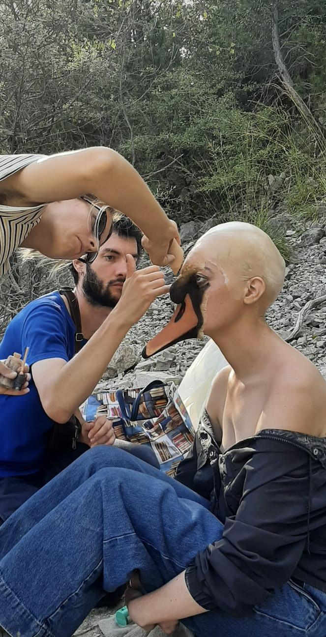 créer les métamorphoses de la femme-cygne avec pose de faux crane, pose du bec, peinture du corps et habillage, prise de son régie de plateau