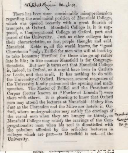 Below: The Whitehall Review, 26 October 1889, reacted unenthusiastically to the opening of Mansfield College.