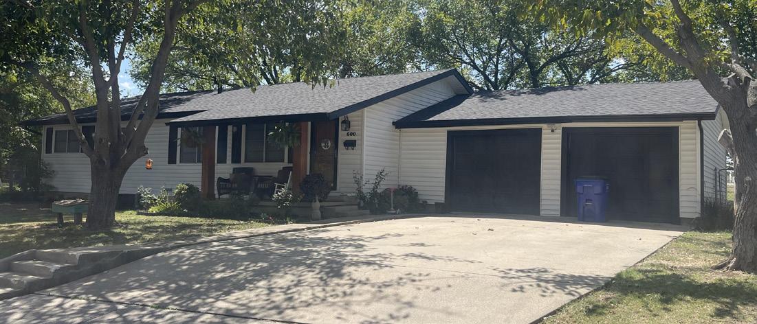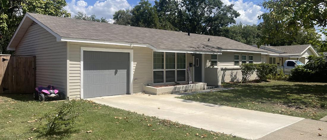 Houses in the Patterson Addition range from bungalows based on earlier homes in Mansfield and Ranch-Style homes that were designed for the automotive age. Ranch-Style houses have low-pitched roofs, a garage or carport, asymmetrical facades, and low horizontal lines. The top photograph shows a bungalow in the Patterson Addition with a garage, reflecting the progression to Ranch-Style homes.