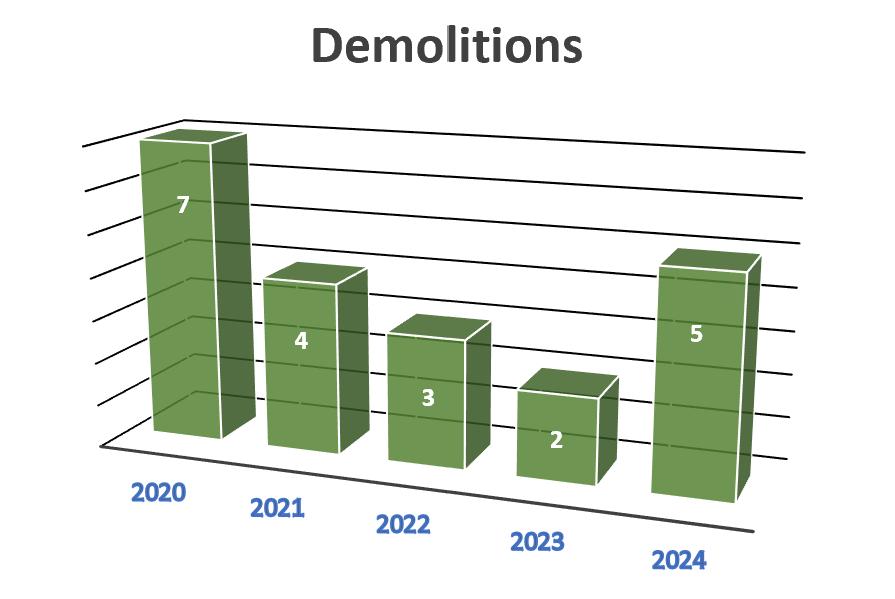 • Since 2020, there have been 21 demolition permits issued for structures listed on the City’s Historic Resources Survey. Five of the permits were issued this year.