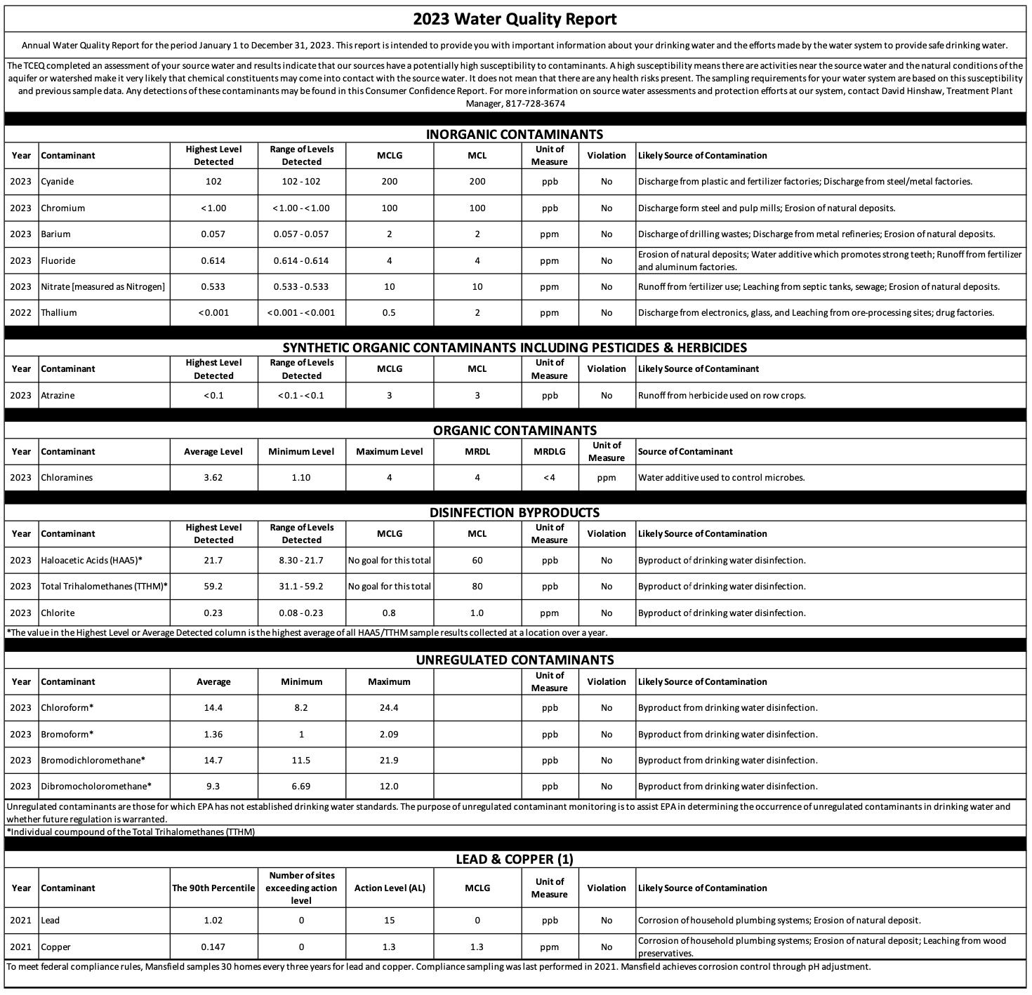 Contaminants may be found in drinking water that may cause taste, color, or odor problems. These types of problems are not necessarily causes for health concerns. For more information on taste, odor, or color of drinking water, please contact 817-728-3674.