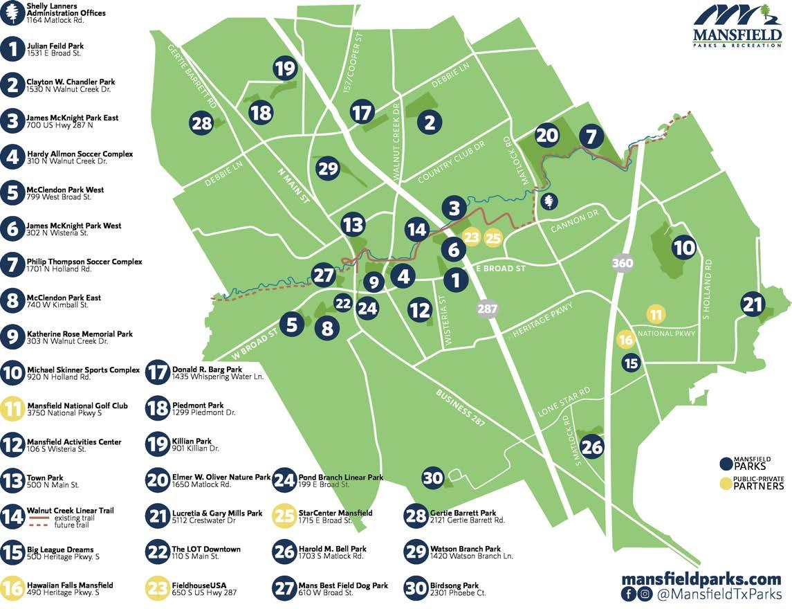 A map of all Mansfield parks and facilities is printed on the back cover, or go to mansfieldparks.com and select Find a Park to see an interactive map that includes park hours and amenities.