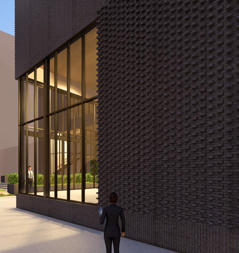 With its alternating composition of brick patterns, the façade of the building brings in the human-scale experience, creating interesting shadows. The dark brick texture also seamlessly blends with the site’s surroundings.
