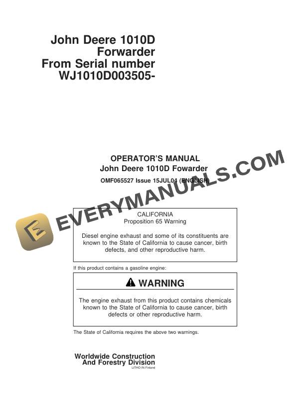 John Deere 1010D Forwarder Operator Manual OMF065527