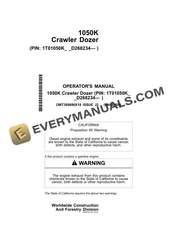 John Deere 1050K Crawler Dozer Operator Manual OMT389886X19