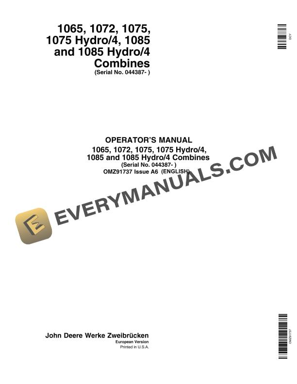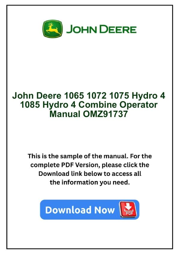 John Deere 1065 1072 1075 Hydro 4 1085 Hydro 4 Combine Operator Manual OMZ91737