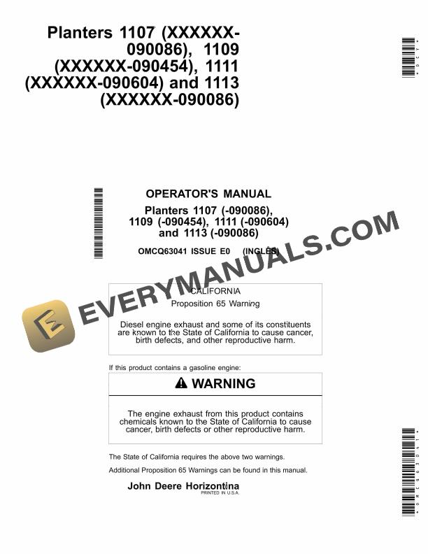 John Deere 1107 (-090086), 1109 (-090454), 1111 ( Operator Manual OMCQ63041