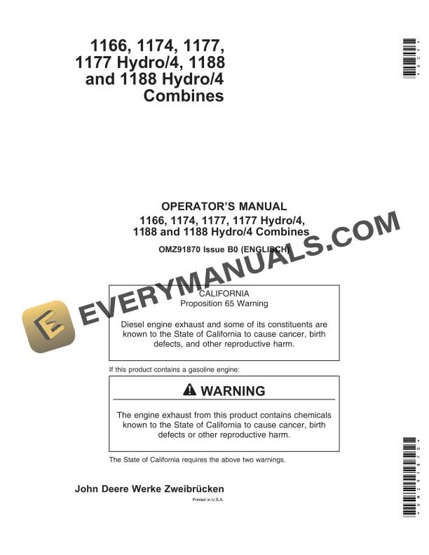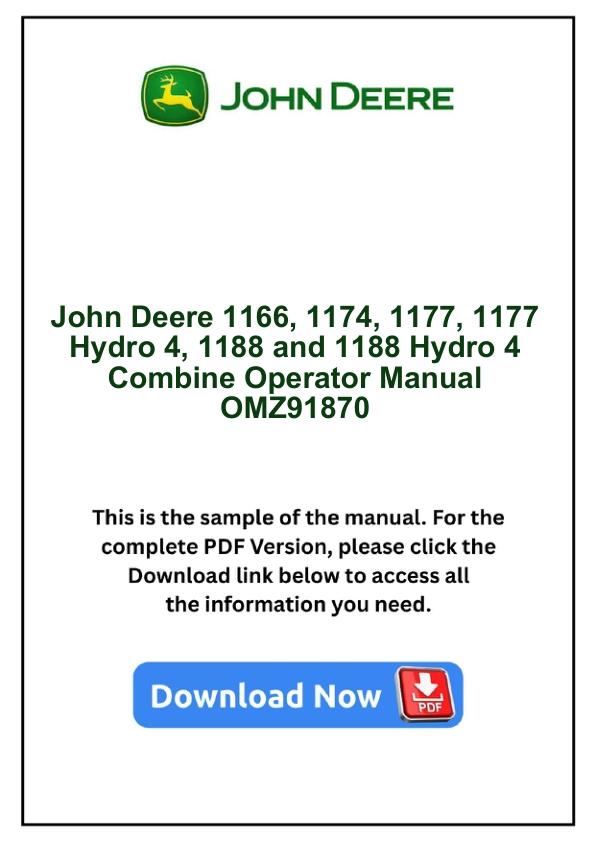 John Deere 1166, 1174, 1177, 1177 Hydro 4, 1188 and 1188 Hydro 4 Combine Operator Manual OMZ91870