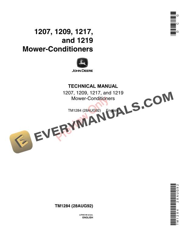 John Deere 1207, 1209, 1217, 1219 Mower Conditioners Technical Manual TM1284 28AUG92