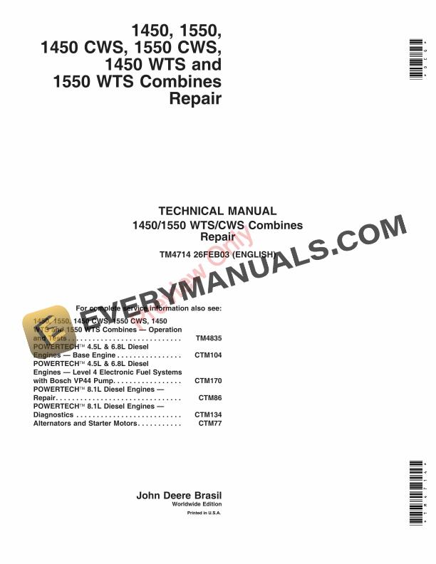 Machine: 1450, 1550, 1450CWS, 1550 CWS, 1450WTS, 1550WTS Combines