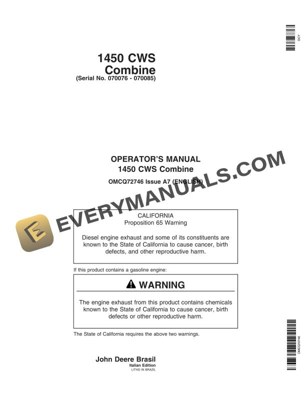 John Deere 1450 CWS Combine Operator Manual OMCQ72746
