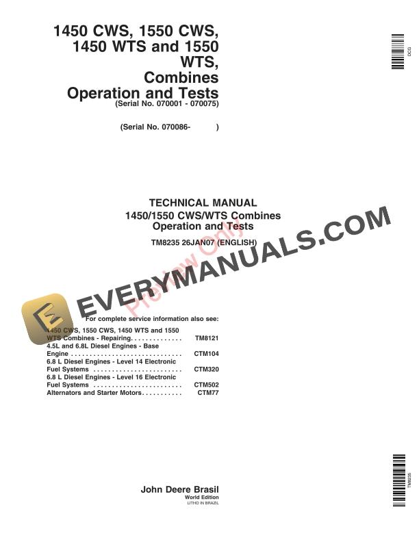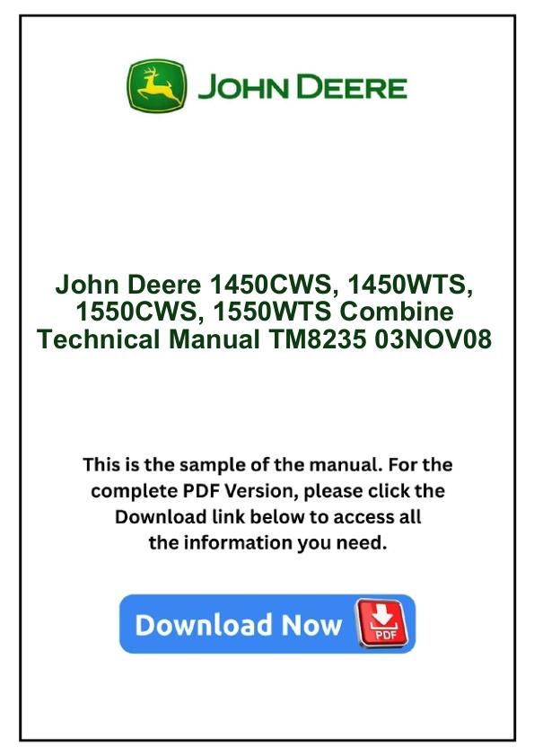 John Deere 1450CWS, 1450WTS, 1550CWS, 1550WTS Combine Technical Manual TM8235 03NOV08
