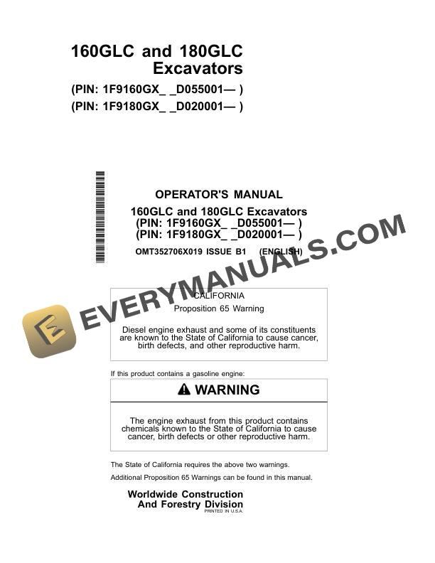 John Deere 160GLC 180GLC Excavator Operator Manual OMT352706X019