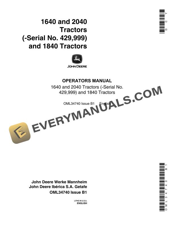 John Deere 1640 2040 1840 Tractors Operator Manuals OML34740