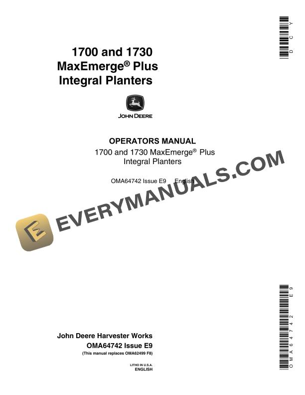 John Deere 1700 and 1730 MaxEmerge Plus Integral Planter Operator Manual OMA64742