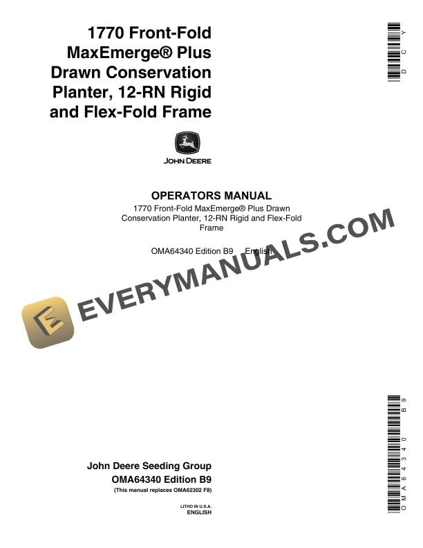 John Deere 1770 Front-Fold MaxEmerge Plus Drawn Conservation Planter, 12 Operator Manual OMA64340