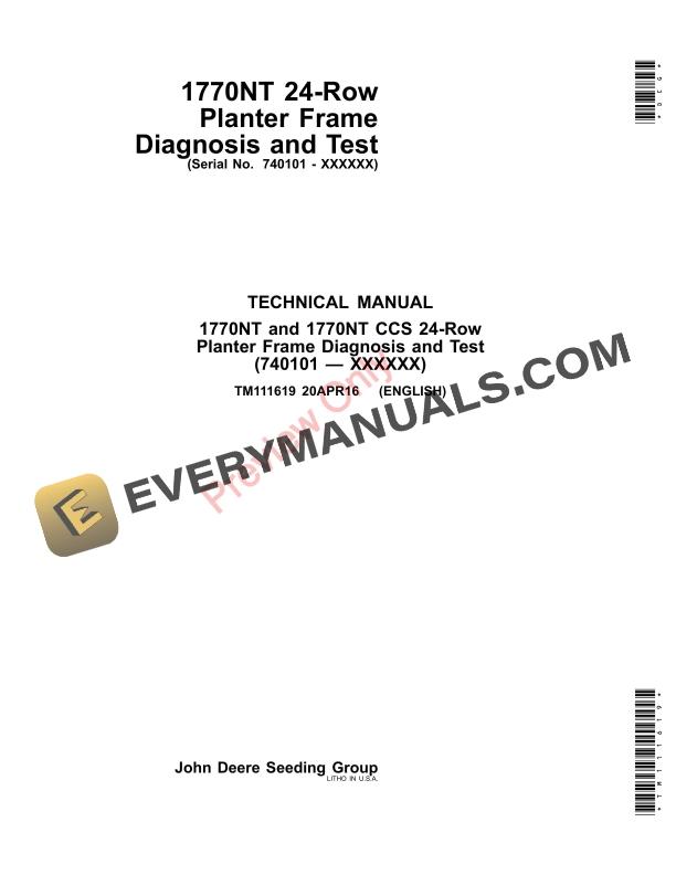John Deere 1770NT 24-Row Planter Frame Technical Manual TM111619 20APR16