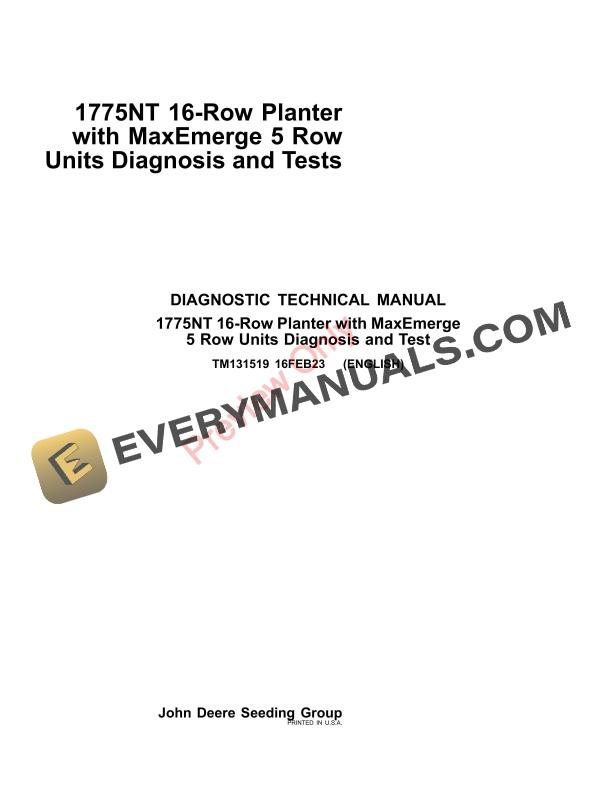 John Deere 1775NT (16-Row) Planters wMaxEmerge 5 Row Units Diagnostic Technical Manual TM131519 16FE