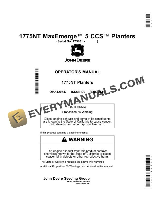 John Deere 1775NT MaxEmerge 5 CCS Planter Operator Manual OMA120547