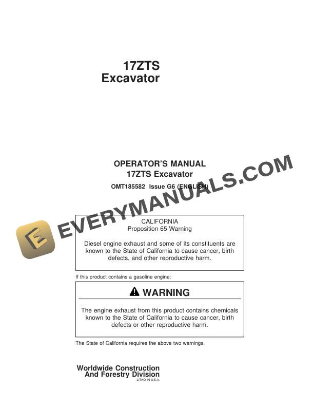 John Deere 17ZTS Excavator Operator Manual OMT185582
