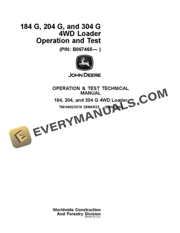 John Deere 184 G 204 G 304 G Loader Test Manual TM14602X019