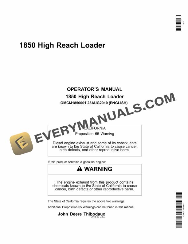 John Deere 1850 High Reach Loader Operator Manual OMCM1850001