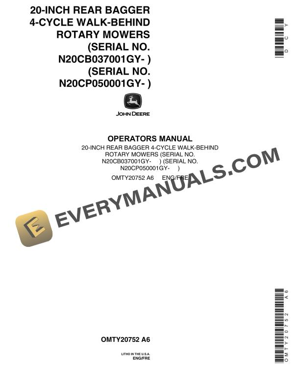 John Deere 20-INCH REAR BAGGER 4-CYCLE WALK Operator Manual OMTY20752